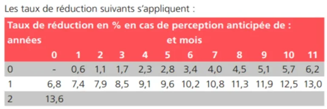 🔗 Voici le tableau du taux de réduction en % de la rente AVS en fonction de l’anticipation.