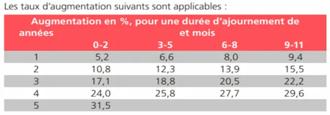 L’ajournement de la rente de vieillesse permet aux assurés de différer le début du versement de leur rente après l’âge de référence, dans la limite de l’âge de 70 ans, à condition que le report soit d’au moins 12 mois (et donc au maximum de 60 mois). Cette mesure entraîne une augmentation proportionnelle de la rente, calculée en fonction de la durée de l’ajournement et de l’espérance de vie, et ne peut être modifiée qu’une seule fois. Elle peut également être combinée avec une anticipation partielle, mais le solde de la rente ajournée doit ensuite être pris intégralement.